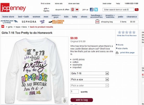 UPDATE: Following some hefty outcry in the media and on Twitter, JC Penney has pulled the shirt from their line. Lisa Simpson would be proud.